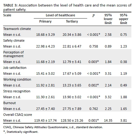 In this study, a significant difference in the mean score of PS attitude was observed between PHCWs and THCWs in terms of teamwork climate, perception of management, job satisfaction, working conditions and stress recognition. Furthermore, the overall score in the seven PS scales of the CSAQ was higher at the tertiary level than that at the primary level. This finding conforms to that of a study conducted in Turkey, which found that the average overall score of PS culture in PHC units is lower than that of hospitals.24 This finding explained why healthcare units do not handle severe clinical cases that can only be handled by intensive care units, emergency departments or hospitals. Because most dangerous medical interventions are performed in hospitals, hospital workers may receive additional training and specialisation in safety-related issues.25 This result is expected because PS topics have largely been identified at the hospital level, with less emphasis placed to the primary care level, where adverse outcomes are less common, and the greatest volume of care is delivered with infrastructure restrictions and guidelines and criteria for safe practices.26