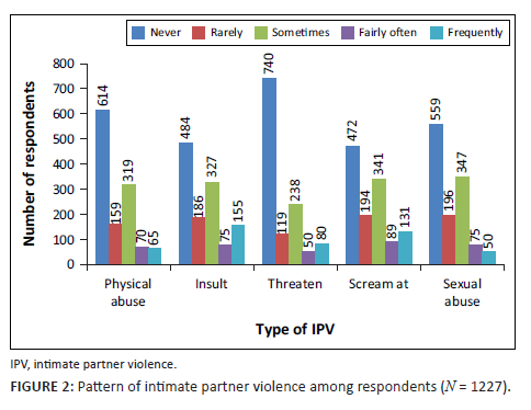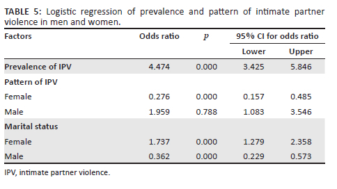 RESULTS: The study found an IPV prevalence of 37.7% among the respondents (confidence interval [CI]: 95%, odds ratio [OR]: 0.169-0.294). The mean age was 38 ± 12 and respondents were mostly female (725, 59.1%), married (770, 62.8%) and unemployed (406, S33.1%), with a tertiary level of education (766, 62.4%). Intimate partner violence was significantly higher among women compared with men (95% CI: 4.474, OR: 3.425-5.846). The pattern of IPV showed a lower OR between sexual and physical IPV (95% CI: 0.276, OR: 0.157-0.485). There was a higher likelihood of IPV among married women (95% CI: 1.737, OR: 1.279-2.358.