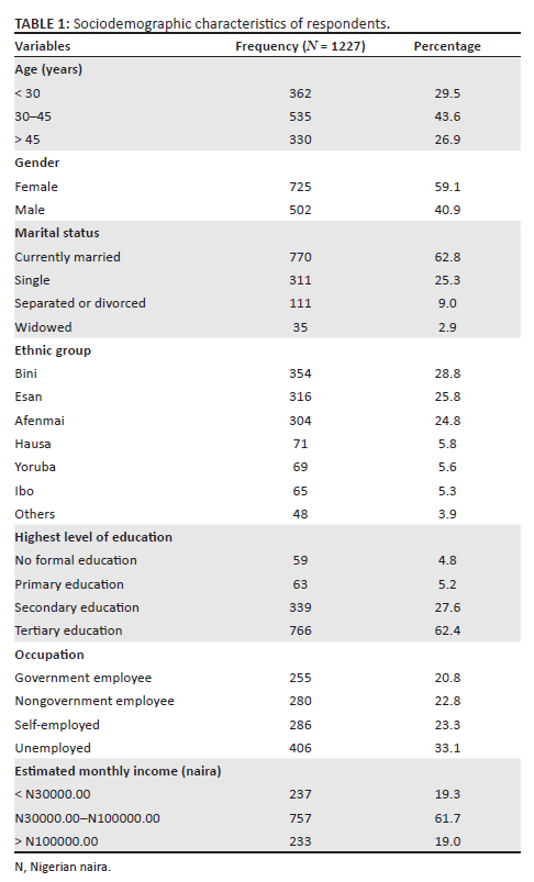A total of 1227 respondents from six LGAs across the three senatorial districts in Edo State participated in the study. Their ages ranged from 18 to 65 years, with a mean age of 38 ± 12. Respondents were mostly female (725, 59.1%), married (770, 62.8%), unemployed (406, 33.1%), with a tertiary level of education (766, 62.4%) and earned between the national minimum wage of N30000.00 (Nigerian naira) and N100000.00 monthly (757, 61.7%).