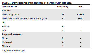 A total of 15 individual interviews were conducted. Of those, 13 were done with persons with DM and two with community representatives. Of the 13 people with DM, eight had no amputation, four had unilateral LLA and one person had bilateral LLA. There were nine women and four men in the DM cohorts with a median age of 65 years (interquartile range [IQR] 58-69) and a median DM diagnosis duration of eight years (IQR 6-20) (Table 1). The two community representatives were a man and a woman. Further details of the demographic characteristics of each of the participants are presented in Appendix 1.