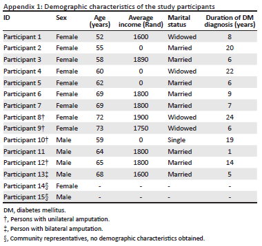 Fifteen participants were recruited purposively from a rural community in EC, SA, following a purposive and convenient approach. The study sample comprised three groups. The first group were persons with diabetes without amputation, identified from within the community through a nonprofit organisation (NPO) involved with the care and support of persons with chronic illnesses and disabilities. Identified persons were approached, and those who consented to the study were interviewed. The second group were persons with diabetes who had already undergone amputation. This group were recruited from the surgery database of the tertiary hospital in EC province where most amputations are conducted. The hospital provided a list of 45 people who underwent diabetes-related amputations in 2021. Only five persons who were reachable via telephone call and were willing to participate were recruited into the study. The third group comprised of the coordinator of an NPO working with people with chronic illnesses and disabilities (including amputation) and one community chief. The authors interviewed this group to understand the barriers or challenges faced by persons with DM-related amputations in the community.