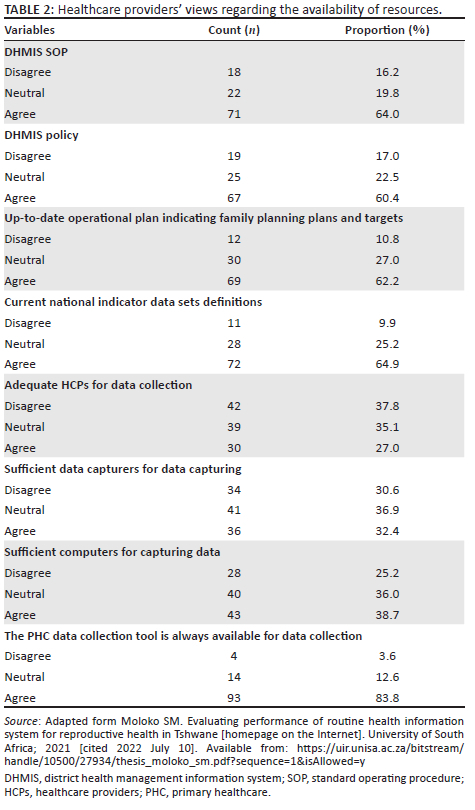 More than 60.0% of the HCPs agreed the DHMIS SOP, DHMIS policy and updated operational plan with family planning service plans and targets, and the latest NIDS definitions are always available when needed for reference. Concerning the adequacy of resources required for data management, few HCPs agreed that the HCPs (27.0%), data capturers (32.4%) and computers (38.7%) were sufficient for data management. However, the majority (83.8%) of HCPs agreed that the PHC data collection tool was always available (see Table 2).