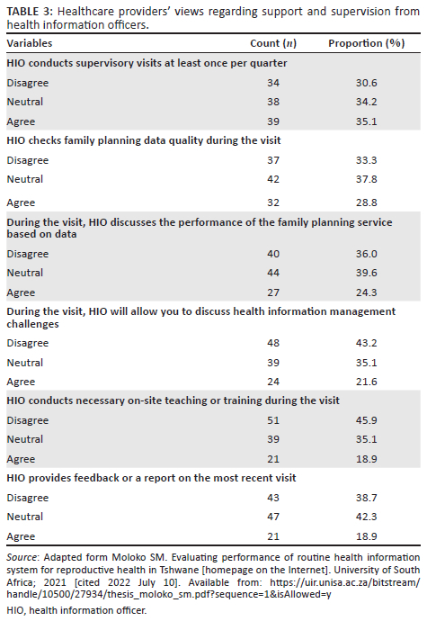 Table 3 shows that only 35.1%, 28.8% and 24.3% agreed that the HIO conducts supervisory facility visits at least once per quarter, checks family planning data quality during the visits and discusses family planning service performance based on the RHIS data during facility visits, respectively. A smaller proportion of HCPs agreed that HIO officers allow them to discuss health information challenges during the visit (21.6%), HIO conducts on-site training when necessary during the visit (18.9%) and HIO sent the report or feedback on the last supervisory visit (18.9%).