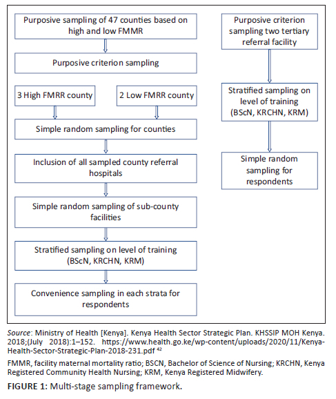 A multi-stage stratified sampling approach was used, as shown in Figure 1. The sample was split between the secondary levels of care (in the counties) and tertiary hospitals based on the number of midwives who worked at RMNCH units. The sample needed from the counties was 301 (52.3%) and 275 (47.7%) from the tertiary hospitals.
