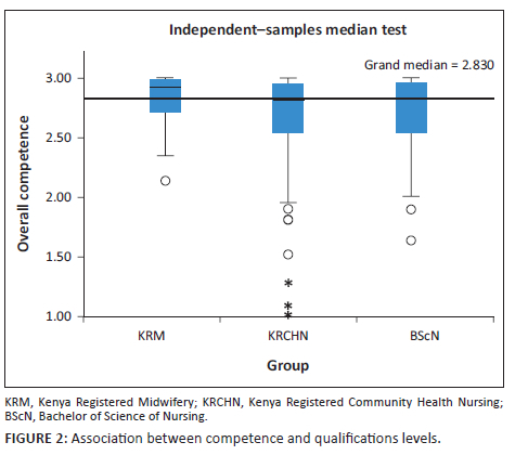 The relationship between qualifications and competence is shown in Figure 2. The median overall competence score for KRM was 2.93 (IQR 2.4-3.0), for KRCHN was 2.80 (IQR 1.9-3.0) and for BScN was 2.82 (IQR 2.0-3.0) (p = 0.016). Post hoc analysis demonstrated that statistical significance was because of the difference between KRM and other qualifications (KRM-KRCHN [p = 0.004]; KRM-BScN [p = 0.018] KRCHN-BScN [p = 0.549]).