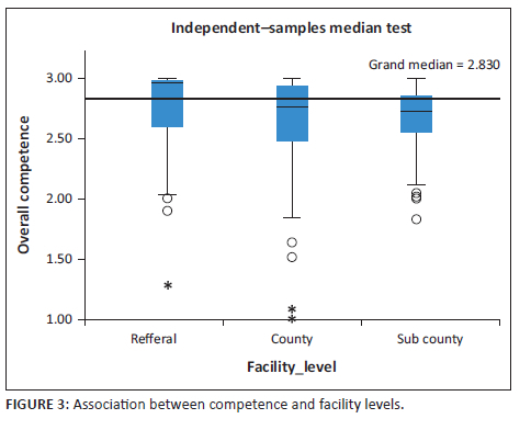 The relationship between competency and facility level is shown in Figure 3. The median overall competency score for the tertiary referral level was 2.98 (IQR 2.0-3.0), for the county level was 2.80 (IQR 1.7-3.0) and for the sub-county level was 2.82 (IQR 2.2-2.8) (< 0.001). Post hoc analysis demonstrated that statistical significance was because of the difference between the tertiary referral hospitals and those who were based at county and sub-county facilities (sub-county-county, p = 0.317; sub-county-tertiary referral, p < 0.001, county-tertiary referral p < 0.001).