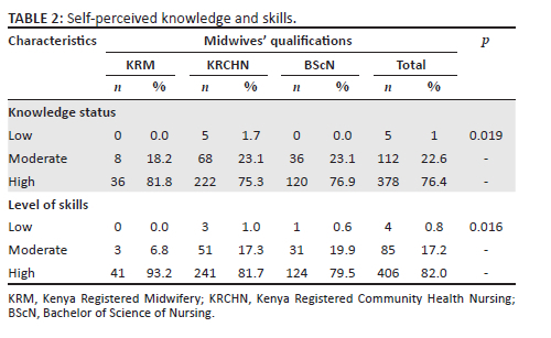 The overall levels of self-perceived knowledge and skills for midwives with different qualifications are presented in Table 2. Overall, the majority of the midwives reported to be up to date with their knowledge (378; 76.4%) and could safely perform the required skills (406; 82.0%).