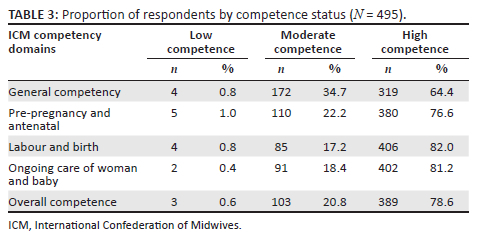Table 3 presents the proportion of midwives by competence status. Overall, 389 (78.6%) of the midwives reported high competence across all the ICM domains. Midwives reported the lowest level of competency in the general competency domain (64.4% had high competence), followed by pre-pregnancy and antenatal care (76.6%), ongoing care (81.2%) and finally labour and childbirth (82.0%). Only a small proportion of less than 1% of the midwives reported low competence in the four ICM domains.