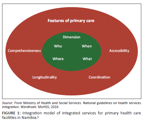 The current study was based on the Namibia integration model (Figure 1), also known as the main four features of primary care. In this model, a nurse will always sit in the consultation room and provide care to the same patient over time. The theory incorporates four features of primary care: accessibility, comprehensiveness, continuity or longitudinality and coordination. The first feature is accessibility, which is the first contact, access and use by addressing geographical, administrative, cultural and time barriers. The second feature, comprehensiveness, ensures that the nurse has all their needs catered for in the consulting room (register, equipment, medicines, etc.) in order to provide all the services that the patient needs within the same room. The third feature, continuity or longitudinality, sees the same nurse following the same patient over time and assuming responsibility for that patient. The last feature in this model is coordination among health care teams across different levels of the health care system. This model assumes a one-stop health care approach, with flexible facilitated referrals within and outside a facility.6 In this study, the Namibian integrated model theory was important to support the results, discussions, conclusions and recommendations of the study.