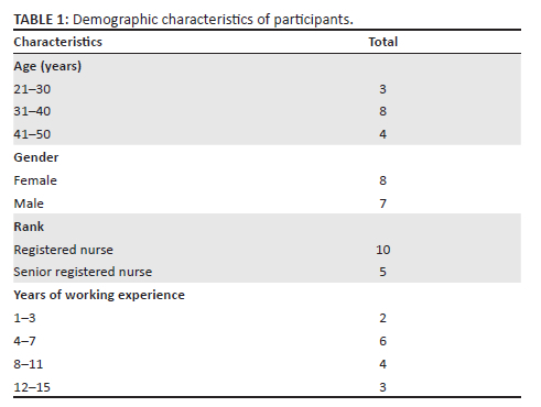 All participants were under 50 years of age, with the majority being between the ages of 31 and 40. The sample consisted of seven male and eight female nurses who were recruited from different clinics within Rundu district. Table 1 gives more information regarding the demographic characteristics of the participants.