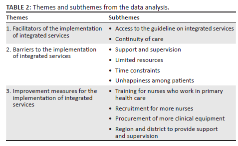 The three themes that emerged from the data analysis were: facilitators of the implementation of integrated services; barriers to the implementation of integrated services and improvement measures for implementing integrated services in Namibia. Table 2 gives a description of the themes and sub themes in the study.