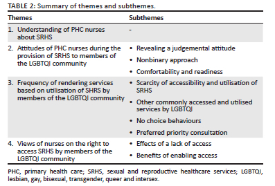 CONTRIBUTION: The findings of this study assisted in demonstrating the PHC nurses' perceptions, experiences, skills and knowledge of LGBTQI SRHS, thus improving the members of the LGBTQI community's accessibility and utilisation of SRHS