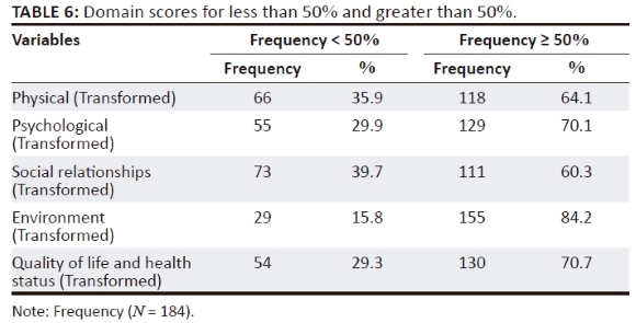 Sixty-six (35.9%), 55 (29.9%), 73 (39.7%) and 29 (15.8%) of the respondents had domain scores less than 50% for physical health, psychological health, social relationships and environment domains, as shown in Table 6.