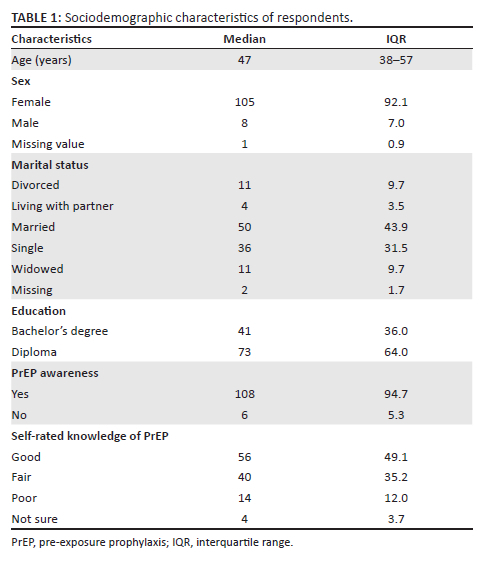 The survey tools were distributed to 127 participants but only 114 completed the questionnaire, resulting in a response rate of 89.8%. The sample included nurses from 10 health facilities providing HIV-PrEP services. The median age of the respondents was 47 years (IQR 38-54). There were more females (n = 105; 92.1%) than males (n = 8; 7.0%). Only a small number of respondents, that is, 9.7% (n = 11) were widowed or divorced, and 3.5% (n = 4) lived with their partners. Most respondents (n = 73; 64%) held a diploma, while 36% (n = 41) held a bachelor's degree (Table 1).