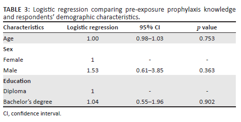 Logistic regression indicated that males were 1.53 times more likely than their female counterparts to identify PrEP as an HIV preventive measure (OR = 1.53; 95% CI 0.61-3.85; p = 0.363). The odds of recognising PrEP as an HIV prevention measure was the same for the nurses who had a bachelor's degree and the diploma qualifications (OR = 1.04; 95% CI 0.55-1.96; p = 0.902). However, the association between both sex and education and knowledge was not statistically significant. Age was not associated with knowledge of PrEP (Table 3).