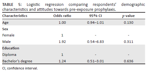 The odds of a positive attitude towards PrEP as an HIV preventive measure were 1.92 times higher among males than females (OR = 1.92; 95% CI 0.54-6.83; p = 0.311) and 1.24 times higher among respondents with a bachelor's degree than respondents with a diploma (OR = 1.24; 95% CI 0.51-3.01; p = 0.636). However, the association between both sex and education and knowledge was not statistically significant. Age was not associated with attitudes towards PrEP (Table 5).