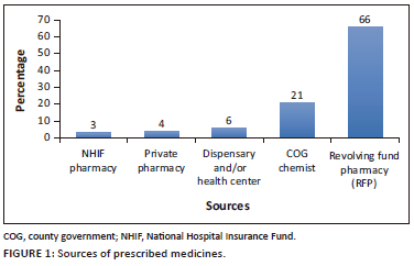Patients could obtain drugs from the county government chemist, private chemists nearby or from a community revolving fund pharmacy (RFP) established in the facilities as a complementary drug supply system because of frequent stock outs of drugs in the main chemist and exorbitant cost in the private sector. The RFPs involved a tripartite agreement with a Memorandum of Understanding between the project that provided seed stocks of drugs, the facility that provided a pharmaceutical technologist and the community that conducted advocacy. A hub and spoke model was adopted with mini RFPs at lower-level facilities that would be expected to refill drugs from the main RFP when stocks dropped.36 Majority of patients (66%) obtained their prescribed medication from the RFP. Further, 21% of patients obtained medication from a county government chemist while only 6% got their medication from either a dispensary or health centre (Figure 1).