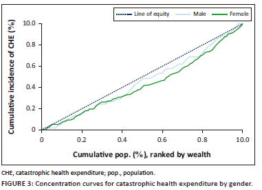Overall, the incidence of CHE was more concentrated in the higher wealth quintile (CIX = 0.112 [95% CI: −0.008 to 0.231], p-value = 0.069) (Table 5). The highest inequalities were among patients with diabetes and hypertension comorbidity (has the largest absolute concentration index) and its related concentration curve was furthest from the line of equality (Figure 2). Besides, the distribution of the incidence of CHE also varied by gender with women having greater inequalities than men (Figure 3).