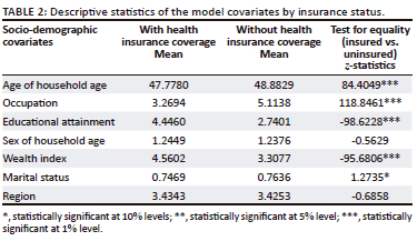 Moreover, the age of the household head, occupation, sex and marital status have been included because of their vital role at the household level in deciding to obtain health insurance coverage. Also, the wealth index is included among the set of covariates in order to account for the differences in the household's ability to obtain health insurance coverage, which significantly affects demand for health and healthcare utilisation. The inclusion of the region is meant to capture geographical differences in access to care in Nigeria. Based on these covariates, it is seen that households with health insurance coverage differ significantly from those who do not have insurance coverage. The statistics mostly supported the notion that obtaining coverage is strongly correlated with the set of covariates included.