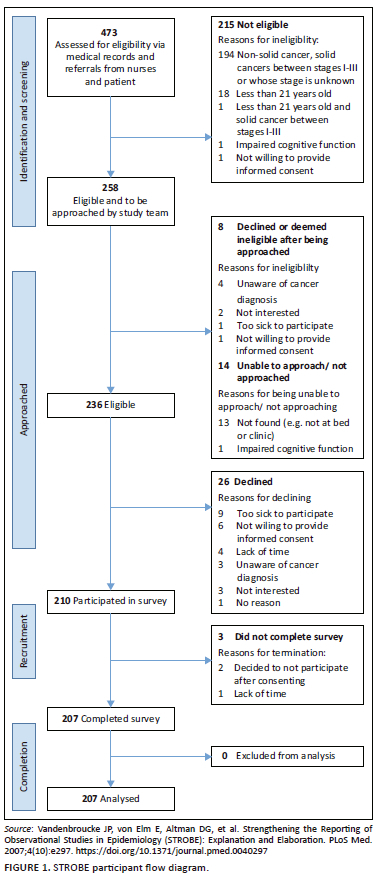 Eligible participants were: (1) ≥ 21 years old, (2) diagnosed with Stage IV solid cancer and (3) able to understand English and (4) seeking treatment at MTRH during the study period. Consistent with the multisite APPROACH protocol, we aimed to recruit a sample of 200 participants.20,21 To obtain this sample size, 473 patients were assessed for eligibility via daily screening of medical records of outpatients seen at the medical oncology and palliative care departments and inpatient medical and surgical wards and referrals from nurses and patient. Of the pool of patients, 266 were deemed ineligible based on medical record review or after being approached for the study or declined to participate. The remaining 207 patients were recruited for face-to-face interviews conducted at MTRH between October 2021 and February 2022. The STROBE participant flow diagram can be found in Figure 122. The Strengthening the Reporting of Observational Studies in Epidemiology (STROBE) checklist can be found in Online Appendix 1.