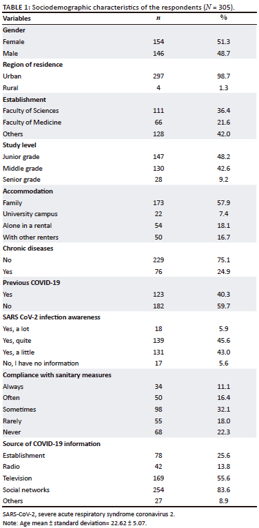 The female population represented 51.3% of the total sample, with a female to male ratio of 1.05. The mean age was 22.62 ± 5.07 years. Among the 305 students, more than 90% were urban dwellers, 47.1% of whom were from Oujda, the capital of the Eastern Region of Morocco.