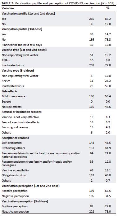 According to their vaccination profile, 87.2% of participants received their first and second doses of the vaccine, and only 14.7% were vaccinated with the third dose. The remaining 12.8% of respondents did not receive any vaccine and were therefore considered unvaccinated.