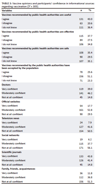 In terms of students' opinions on vaccines recommended by public health authorities, 43% believe such vaccines are useful, 37.7% assume their effectiveness, and 35.4% indicate that their safety could be presumed. Yet, 51.1% of all participants clearly indicated that there was no public acceptance of the COVID-19 vaccines. Besides, 39% of students expressed their confidence in doctors and 43.8% in scientific journals as a source of information regarding immunisation. Furthermore, television news (50.5%), social networks (56.1%), family, friends and acquaintances (51.3%) were not deemed as a reliable source.