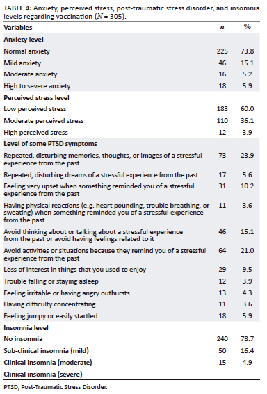 The severity of insomnia symptoms and anxiety regarding vaccination were also investigated. According to the scales analysis, 11.1% (n = 34) of students had moderate to severe anxiety, 40% (n = 122) expressed moderate to high level of stress, and 4.9% (n = 15) had a moderate level of insomnia towards vaccination. The rates of some post-traumatic stress disorder symptoms are detailed in Table 4.