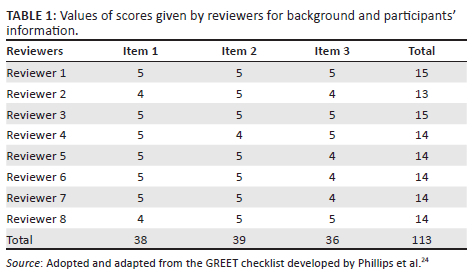 The values of scores given per item by the reviewers were used to calculate the domain score for this section and are shown in Table 1.