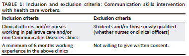 Phase 2a - Intervention delivery: Health workers (enrolled nurses and/or clinical officers) with a minimum experience of 6 months providing primary health care services at either the palliative care or NCD clinics at Mangochi district hospital were purposively selected to receive the communication skills training and mentorship intervention. Study information was provided, and written consent was obtained from participants. Inclusion and exclusion criteria are listed in Table 1.