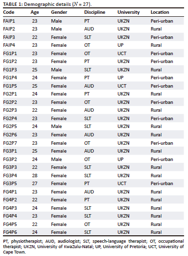 Of the 30 who were invited to participate, 27 agreed, of whom 22 were female with their ages ranging from 22 to 30 years, with five working in peri-urban and 22 in rural areas. Two participants obtained a BSc (Hons) in Physiotherapy and a BA in Speech-Language Pathology as a second qualification.