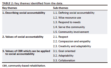 RESULTS: Despite most of the participants not being instructed in social accountability as part of their formal training or institutional induction, three themes emerged based on their experiences. These themes include describing social accountability, values of social accountability, and values of community-based rehabilitation applicable to social accountability