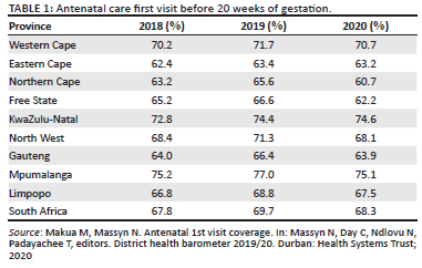 The World Health Organization (WHO) recommends that pregnant women must attend a minimum of eight antenatal care contacts.1,2,3Antenatal care contacts help health care professionals identify problems that could pose risk to the health of the mother and the baby.4 Interventions such as micronutrient supplementation, treatment for hypertension to prevent eclampsia and tetanus immunisation are provided to pregnant women.5,6 Maternal infections such as human immunodeficiency virus (HIV) and syphilis are detected and treated to prevent mother-to-child transmission that could lead to premature births, low birth, stillbirths and neonatal deaths.7,8,9,10 South Africa has adopted the WHO recommendations through the Basic Antenatal Care (BANC) policy, and essential antenatal care services are offered for free in all public health facilities.10,11,12 Women are encouraged to attend their first antenatal care visit before 20 weeks of gestation.13 However, women in South Africa only start attending antenatal care after 20 weeks of gestation, and in some cases, they do not attend at all.13,14 In 2020, only 68.3% of women in South Africa attended their first antenatal care visit before 20 weeks of gestation, and this was a decline from the 69.7% recorded in 2019 (Table 1).14