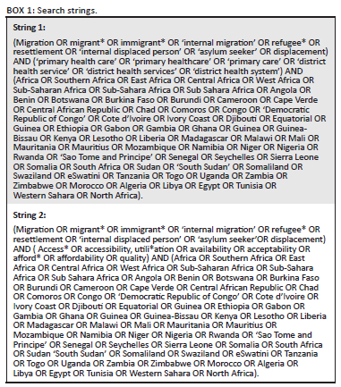 To identify the original studies and the grey literature related to PHC and migration, we systematically searched six databases: Scopus, PubMed, Cumulative Index to Nursing and Allied Health Literature (CINAHL), Web of Science, African Journals Online and Embase. The databases were chosen for their international coverage of health sciences literature, interdisciplinarity and complementarity. Cumulative Index to Nursing and Allied Health Literature specifically included publications in French. Research repositories from selected African universities were searched to incorporate the regional grey literature. Two top ranking African universities from each African region (southern, western, eastern, central and northern) were selected.19 In addition, several migration related organisational websites were searched for relevant research. These included: African Centre on Migration Studies, WHO, United Nations High Commissioner for Refugees (UNHCR), International Organization for Migration (IOM), United Nations, (International) Children (Emergency) Funds (UNICEF, UNCF), Medecins Sans Frontieres (Doctors without borders, MSF), African Union (AU) and Southern African Development Community (SADC).