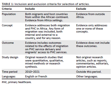 RESULTS: A total of 3628 studies were identified and 50 were included. Most studies were descriptive or used mixed methods. Publications came from 25 countries, with 52% of studies from South Africa, Uganda and Kenya. Most migrants originated from Zimbabwe, the Democratic Republic of Congo and Somalia. Population health management for migrant communities was challenging. Migration impacted PHC services through an increase in infectious diseases, mental health disorders, reproductive health issues and malnutrition. Primary healthcare services were poorly prepared for handling displaced populations in disaster situations. Access to PHC services was compromised by factors related to migrants, health services and healthcare workers