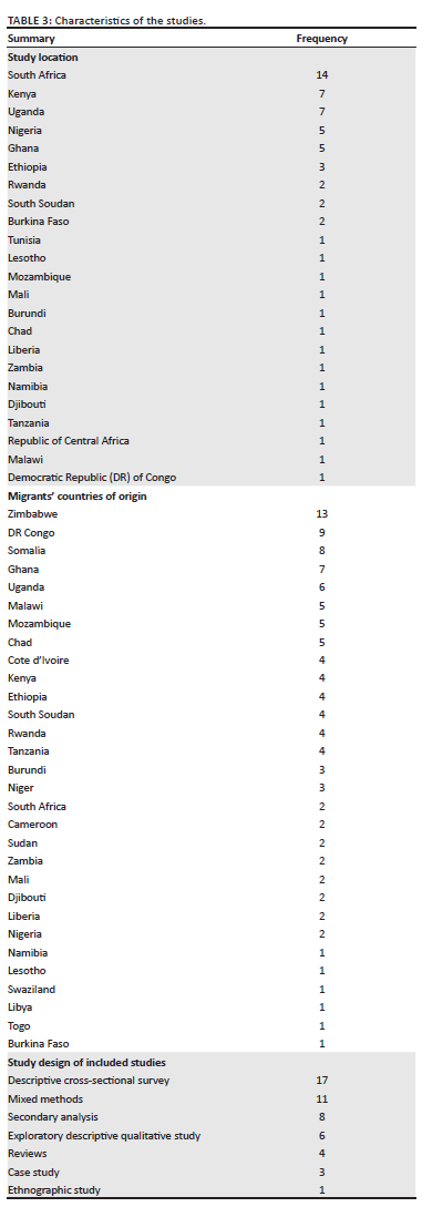 Table 3 describes the characteristics of the selected studies. Out of the 25 countries where data were collected, 26 out of the 50 studies (52%) were conducted in South Africa, Uganda and Kenya. Migrants came from 32 different African countries, but research on those originating from Zimbabwe, Democratic Republic of Congo, Somalia, Ghana and Uganda predominated, with several studies including migrants from several different countries in the host country. The number of publications per year was consistently small and showed no particular trend over time (Figure 2). Most studies were descriptive or mixed methods.