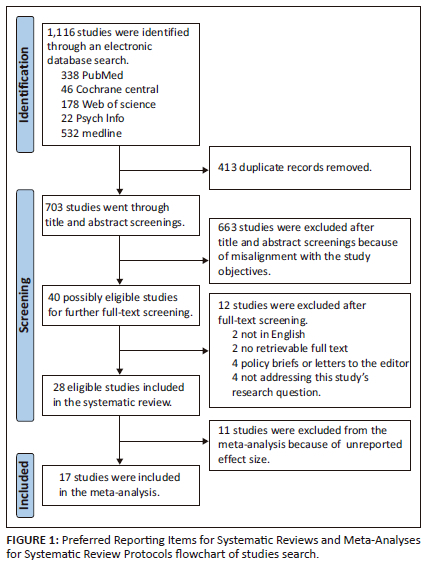 The electronic database search yielded a total of 1116 studies, which were screened based on the search, and 413 duplicate studies were removed. The remaining 703 studies underwent further screening, of which 663 studies were excluded because they did not satisfy the research aim and objectives. The remaining 40 studies were subjected to full-text screening, and 12 of them were excluded for a variety of reasons, including the fact that they were not in English, did not have retrievable full text, were policy briefs or letters to the editor, or did not directly address the research question. Moreover, 28 studies were ultimately found to be eligible for meta-analysis. The studies were also the subject of a meta-analysis, and 11 of them were not included because ORs were either not reported or missing some aspects. A total of 17 (n = 17) studies were finally included in the meta-analysis (Figure 1). All studies included were either cross-sectional or observational by design - no interventional studies were identified.