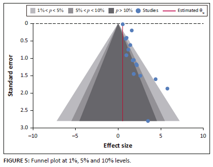 Figure 5 presents a funnel plot at 1%, 5% and 10% levels and Figure 5 assesses publication bias. A visual inspection revealed that the left-hand side (LHS) of the plot missed significant study results. Of the total 17 (n = 17) studies, only 3 did lie outside the funnel plot while the majority 16 did lie within the funnel plot on the right-hand side (RHS) of the line of no effect, indicating the presence of minimum publication bias across the studies used in this meta-analysis.