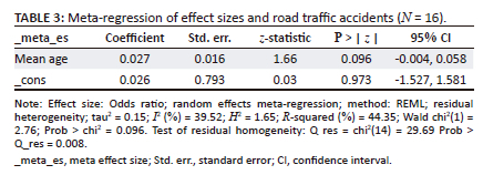 RTAs were defined as any motor vehicle collision (MVC) on any public road. To identify the potential source of heterogeneity based on the available data, a meta-regression testing the relationship between mean age (moderator variable) and meta-effect size was conducted. Stata statistical software version 18 for Windows was used to conduct all statistical tests and analyses covered in this study.