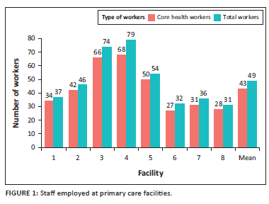 Figure 1 displays the staffing levels at the six urban (numbers 1-6) and two rural clinics (number 7 and 8). Generally, urban primary care facilities have larger staff sizes compared to rural primary care facilities.