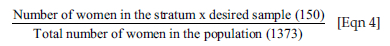 where: χ is a measure of response rate, n is the sample size, N is the population size, r is the fraction of responses that you are interested in, Z(c/100) is the critical value for the confidence level c, and E is the margin of error. Using a value of 7.56% for the margin of error, a 95% confidence level corresponding to an Z-score of 1.96, a population size (N) of 1373 and an assumed response distribution (p) of 50%, a sample size of 150 was determined for the survey respondents. To ensure proportional representation, the sample was stratified according to the number of eligible women in each geographic region using equation 4 below: