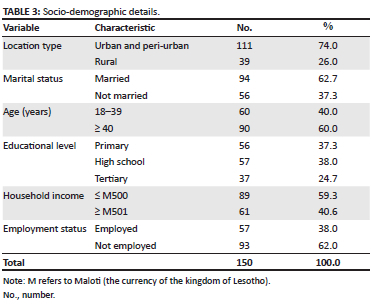 Table 3, shows all the 150 women who were invited to participate, with the majority 111 (74%) residing in urban (Ha-Shalabeng) and peri-urban areas (Ha-Molengoane), while 39 (26%) lived in a rural area (Ha-Setoko). Most participants were married (94; 62.7%), aged 40 and above (90; 60%,), had completed high school (94; 62.7%), earned less than M500 a month (89; 59.3%) and were unemployed (92; 62%).