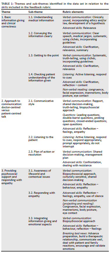 We observed similar patterns and trends in students' communication skills across the two data sets for the BBN and BMI PRP scenarios. We identified three overarching themes in the data related to our observations of students' communication skills in the scenarios, namely: (1) Basic information giving and clinical correctness, (2) approach to communication: doctor-centred versus patient-centred talk and (3) providing psychosocial support and showing empathy. The major themes and sub-themes identified in the data are included in Table 1, together with relevant elements from the rubric used to provide feedback to students. (Note that S = Scenario.)