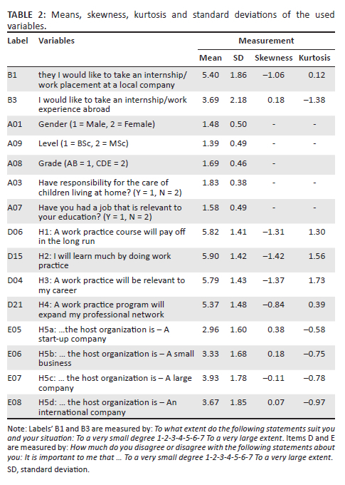 Table 2 displays the mean score, the kurtosis and the skewness as well as the standard deviation of the involved variables. Table 2 reveals that the mean for item B1 'I would like to take an internship/work placement at a local company' is 5.40 on a Likert scale ranging from 1 (To a very small degree) to 7 (To a very large extent), while the mean for the item B3 'I would like to take an internship/work experience abroad' is 3.69 on the same scale. A t-test gives that B1 is significantly higher than B3 (t-test = 0.00).
