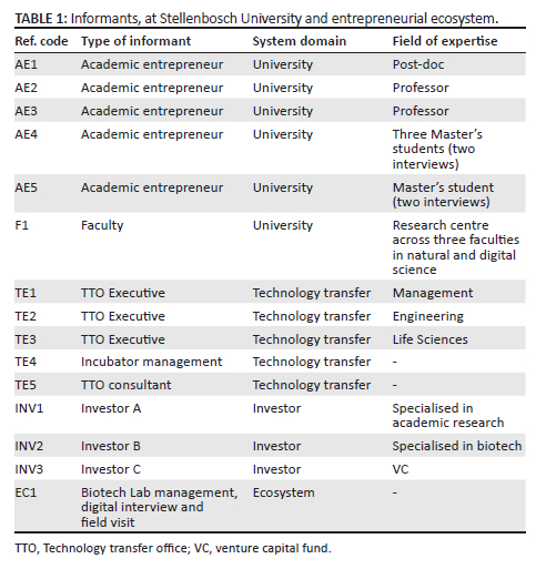 Semi-structured interviews were used to collect data from investors from the entrepreneurial ecosystem in the Western Cape area in South Africa. Three interviews were conducted with investors functioning like key informants for funds and VC organisations. Discussions revolved around topics such as experience with cooperation between TTOs and ASOs, perception of benefits, risk and challenges, criteria for investments cases and strategies, as well as motivation for cooperation and visions for ecosystem development. In addition, several semi-structured interviews were conducted with academic entrepreneurs affiliated to the university (five), TTO executives (three), one with the university incubator, one TTO consultant and one Biotech lab/Incubator. These interviews were conducted to gain more insight on the role of investors from other perspectives as well as to validate data the investors perspective. In total, 14 interviews were conducted (see Table 1 for an overview).