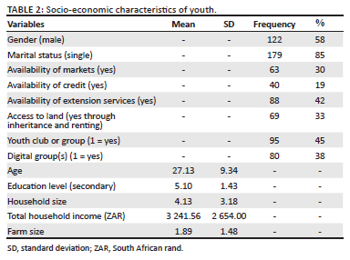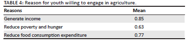 Table 2 represents the socio-economic traits of youth engaging in farming practices. The study results reveal that males are the most dominating gender when it comes to youth involvement in agriculture with a mean age of 27 years. This is the case because of the perception that agriculture is demanding and requires energy to operate, which scares females from participating. These results aligned with the findings of Douglas, Singh and Zvenyika (2017), Bergman et al. (2019), Mujuru et al. (2022) and Thibane et al. (2023) that males dominate agricultural enterprises as they easily get information from their counterparts, unlike females. The study further shows that youth participating in agriculture are literate as they have secondary education as they spend more than 11 years in school in attaining skills and knowledge, which plays a pivotal role in operating the agricultural enterprise as well as knowing the reasons for participating in farming activities. Secondary education contributes significantly to the skills and knowledge required for successful participation in agriculture. These results further state that being educated was beneficial to farmers in terms of adopting new innovative techniques and they were able to interpret agricultural information that benefitted the enterprise. These results aligned with the findings of Giwu (2024) and Cheteni (2016) who revealed that educated youth were more likely to view agriculture as a viable career option. The family size was utilised as a proxy for domestic labour. The average household comprised four individuals, who significantly contributed to family labour, thereby reducing the need for hired labour for agricultural operations. These results were in line with Mdoda, Christian and Agbugba's (2023) study that the majority of the households in the Eastern Cape province have four people per household. The youth involved in agricultural enterprises were single, which was beneficial in terms of allowing youth to embrace risk preferences, facilitating income generation and engaging in risk-taking behaviours in farming.