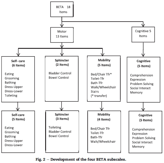 Considering the above nursing concerns plus the existing clinical knowledge and the Rasch reporting on category disordering, a decision was made to create a four-subscale structure for the BETA (see Fig. 2). The four Beta subscales are referred to as the self-care, toileting, mobility and cognitive subscales. From here onwards the four subscales were each calibrated separately. As Verhalst and Glass (1995) state, there are two methods that scale developers may use to enhance measurement construction, namely to omit "bad" items and/or temporarily remove the observations that clearly misfit the Rasch model. The main consideration for grouping and deleting items to create the four BETA sub-scales was to secure fit to both the nursing logic and the Rasch model.