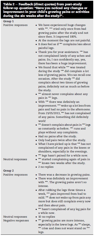 Group 1 reflected an overwhelmingly positive response with 12 parents/guardians giving positive responses, one giving what can be considered a neutral response, and two not responding at all. For Group 2 there was one negative response saying the growing pains got worse, four positive responses, and ten did not respond. See Table 2 for detailed feedback from the post-study follow-up question.