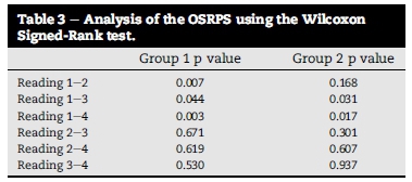 The Wilcoxon Signed-Rank test was used to demonstrate at which point any statistically significant improvement occurred (p < 0.05). Table 2 represents the statistical p value results of the OSRPS scores using the Wilcoxon Signed-Rank test. Group 1 showed a significant change in the OSRPS rating right from the start with a p value of 0.007 from reading 1 to reading 2. Group 2 only started showing a significant change from reading 1 to reading 3.