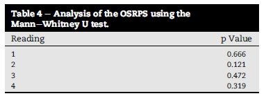 Table 4 represents the statistical p value results of the mean OSRPS scores using the Mann-Whitney test. The p value for the first reading was 0.666. As the p value of the first reading was not <0.05, it shows no statistical significance and indicates that the two groups started off comparable. No statistical significance was noted between the two groups over the four readings.